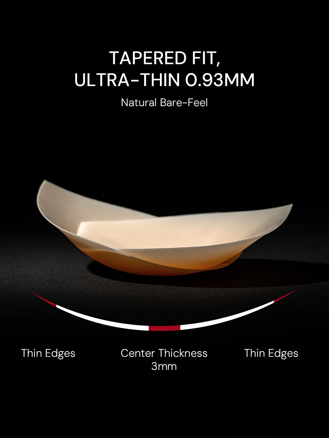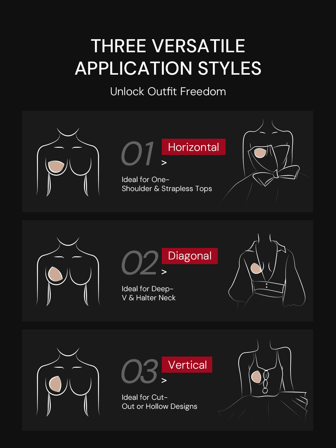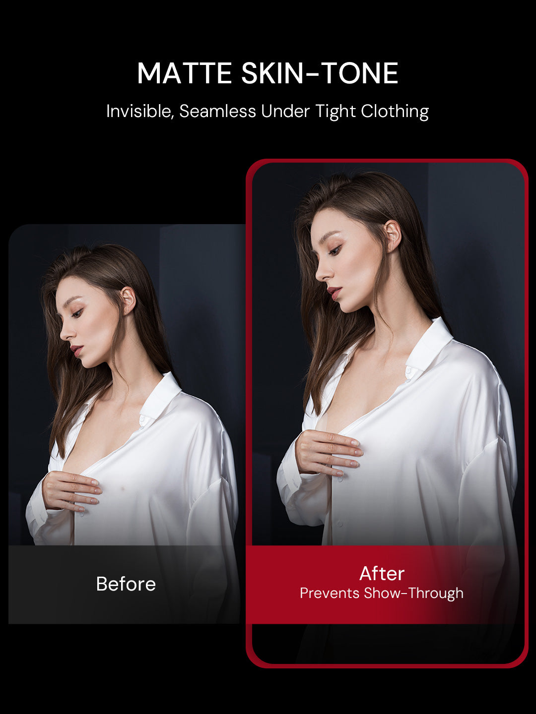 The Half-Moon Nipple Covers are designed for fashion-forward women, featuring a custom half-moon shape ideal for low-cut and straight-neck outfits. Flexible application allows horizontal, diagonal, or vertical placement for ultimate outfit freedom. Matte skin-tone provides seamless invisibility under tight clothing and excellent show-through prevention. Tapered design with a 3mm center and ultra-thin 0.93mm edges ensures natural, bare-feel comfort while perfectly conforming to the bust, enhancing confidence and style.