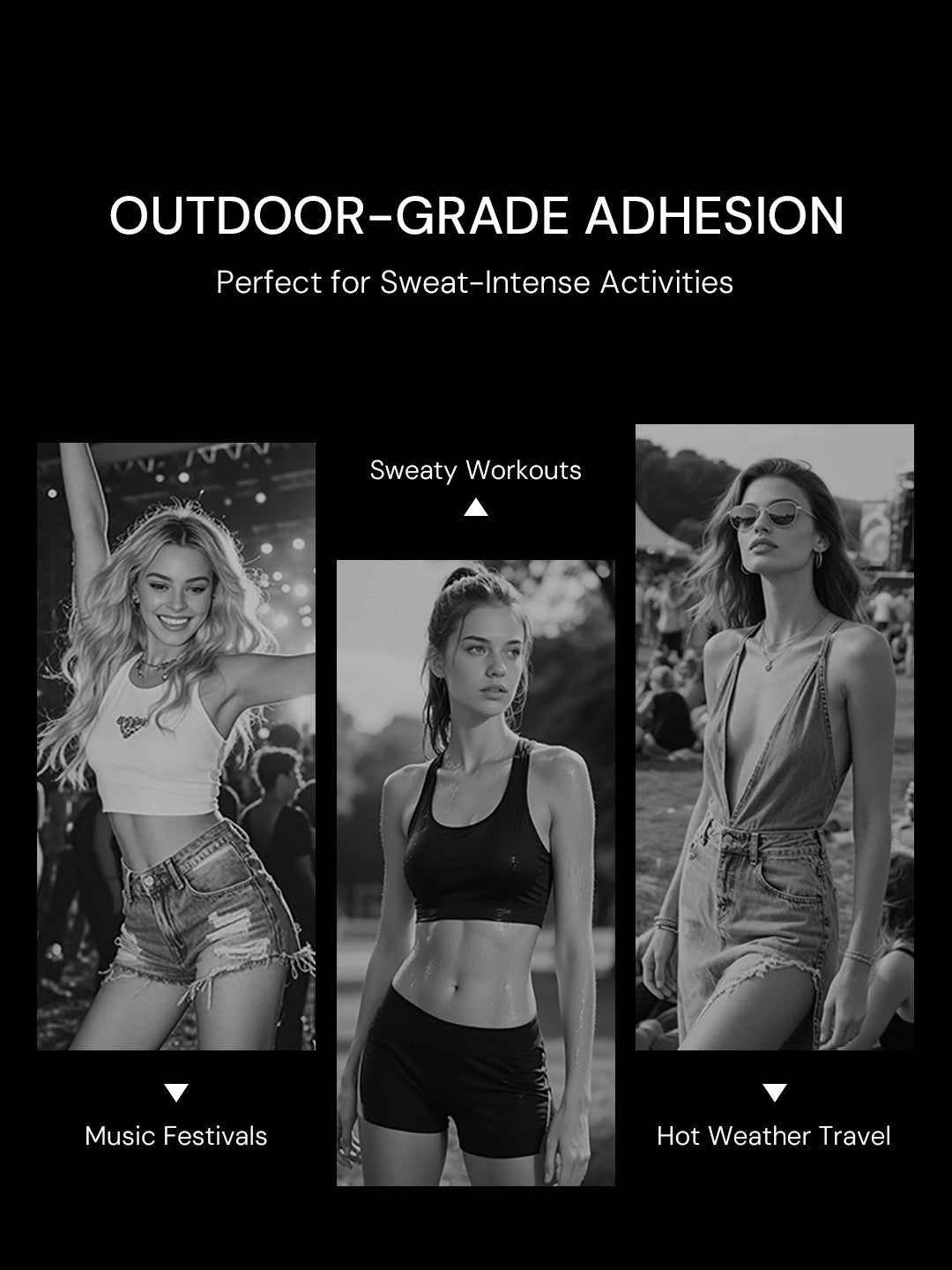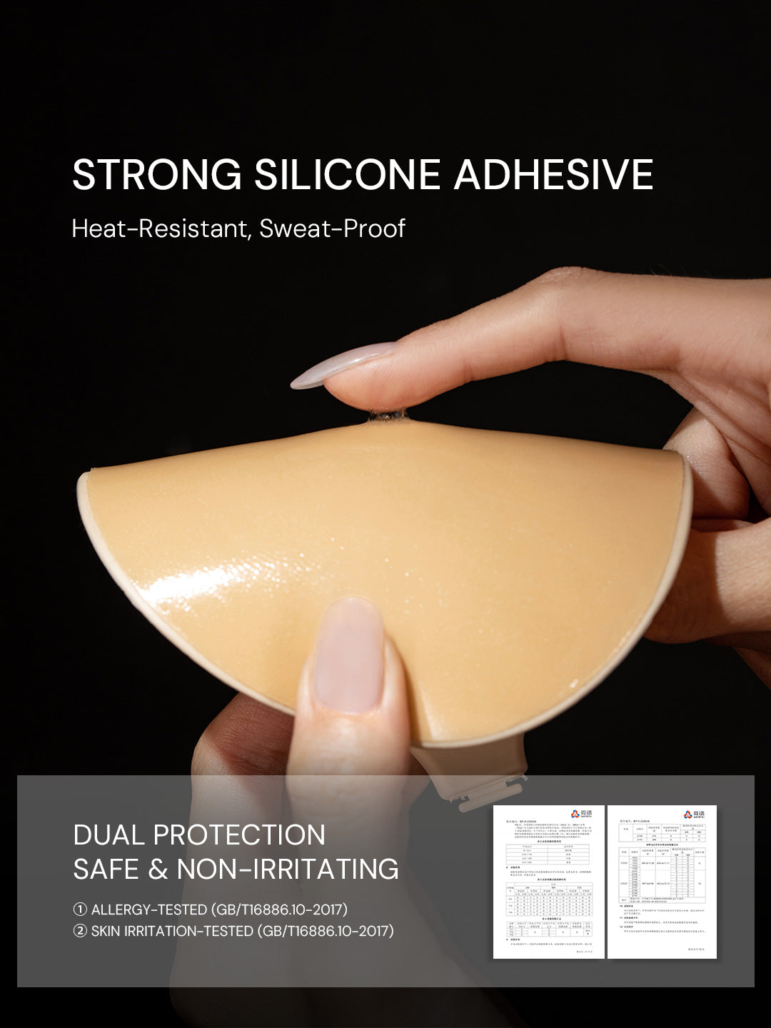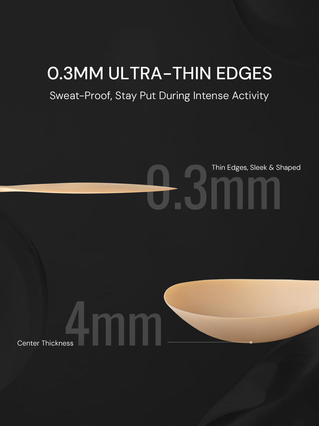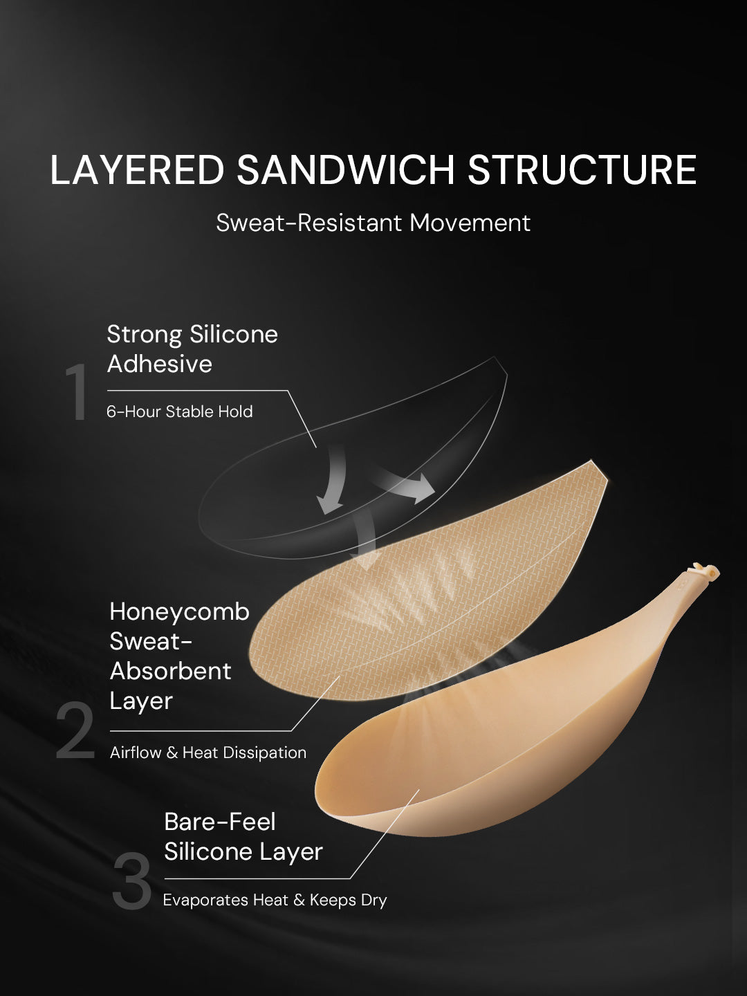 The Ultra Sweat-Resistant Adhesive Bra is engineered for high-heat, intense workouts, and sweat-heavy conditions. Featuring strong silicone adhesive, it resists heat and maintains stable adhesion for up to 6 hours. Its layered sandwich structure, honeycomb sweat-absorbent layer, and bare-feel silicone layer promote airflow, heat dissipation, and keep skin dry. Ultra-thin 0.3mm edges stay sleek and secure without curling, while the center thickness (~4mm) provides optimal lift. Allergy- and skin irritation-tested, it ensures a safe, comfortable, and sweat-proof fit for workouts, festivals, or hot-weather adventures.